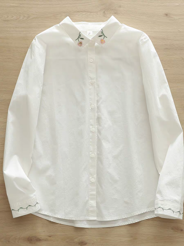 Women Petal Collar Embroidered Shirt – Soft White Cotton Elegance