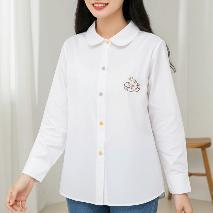 Sweet Dreams Cat Embroidered Shirt – Playful Charm Meets Everyday Comfort