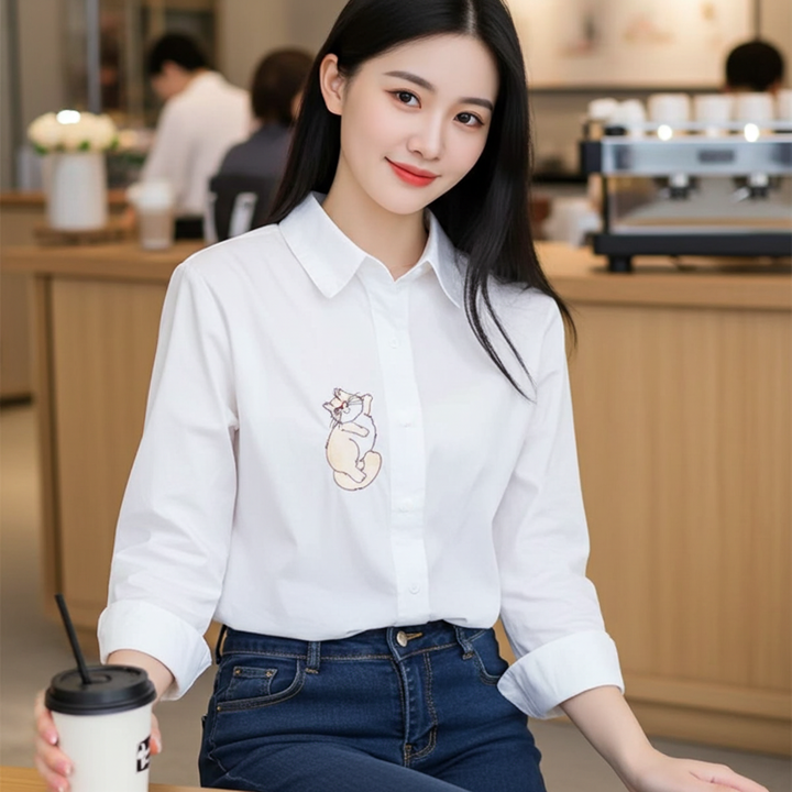 Lazy Cat Embroidered Women’s White Shirt – Playful & Chic Button-Up