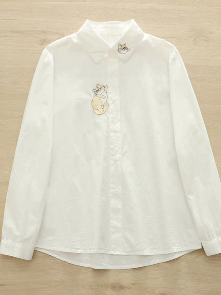Add a cozy, playful twist to your everyday wardrobe with this crisp white shirt featuring adorable embroidered cats. A fluffy cat stretches lazily down the front while a cute cat face peeks out from the collar—perfect for cat lovers who appreciate subtle, charming details.
